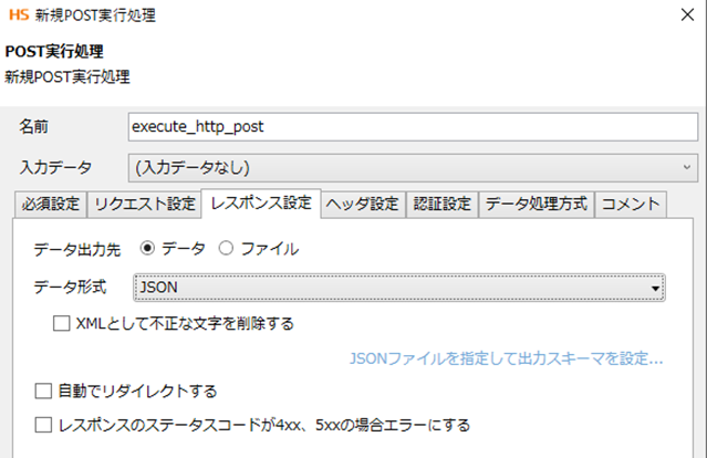 次に、レスポンス設定タブに移動します。ここではレスポンスをどのように扱うかの設定を行います。今回はレスポンスの内容を変数に代入しなければならないので、データ出力先を[データ]に、データ形式は[json]を選択します。