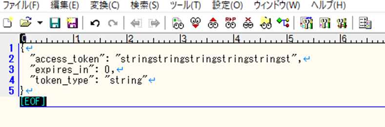 作成し次第、token.jsonを開きます。エディタが表示されるので以下を入力して保存します。