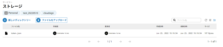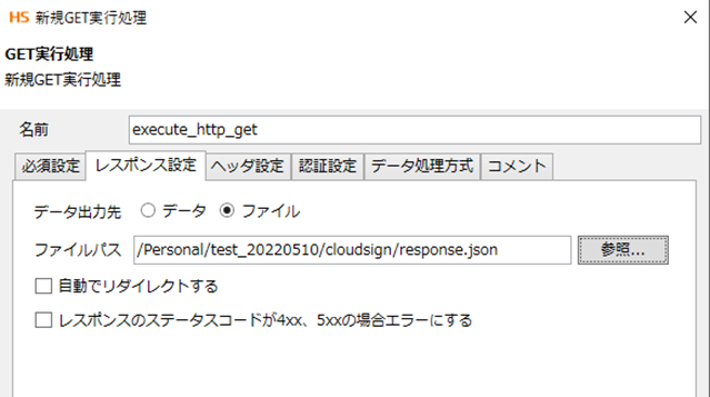 今回はデータを取得したいだけなので、データ出力先をファイルに設定します。なお、ファイルパスに関しては任意で構いませんが、今回は[/Personal/test_20220510/cloudsign/response.json]としておきます。