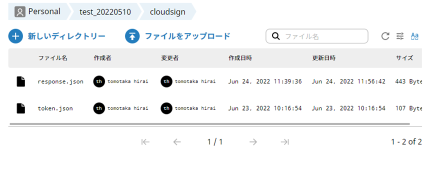 スクリプトが完了したら、HULFT Square内のエクスプローラーを開きファイル出力先に指定したディレクトリを確認してみてください。response.jsonが作成されていて、作成したユーザーの情報が入っていれば成功です。(UTF-8ですので文字化けしている場合はresponse.jsonを右クリックしてローカルにダウンロードし、windowsのnotepadなどで表示してみて下さい)