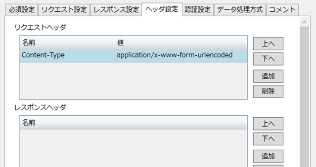 最後にヘッダ設定タブを開いて、リクエストヘッダで[追加]を選択し、[Content-Type]の設定を行います。
