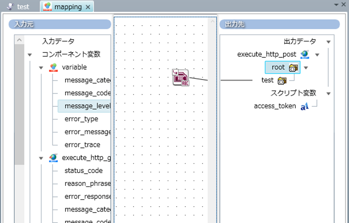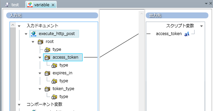 左側の[execute_http_post]>[access_token]を右側の[スクリプト変数]>[access_token]にドロップすると、以下のようにデータフローを作成することができます。