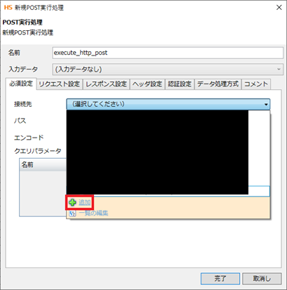 接続先のテキストボックスを選択して、「追加」を選択します。この設定ではRESTでの接続先のURLを設定することになります。後ほど設定する“パス”はこの設定の後ろへと付加され、最終的なendpointとなります。