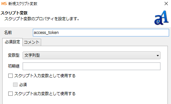 変数名は任意ですが、今回は[access_token]と入力、変数型は文字列を指定して[完了]を選択します。