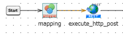 今回、post実行する際のリクエストデータは不要ですが、エラー回避のためにリクエストデータを作成します。右のツールメニューの[変換]>[処理]>[マッピング]をスクリプトにドロップし、作成したpost実行コンポーネントにドロップしてプロセスフローとデータフローを結びます。