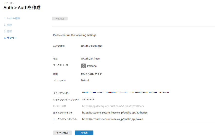 freee側でアプリケーションを作成した際に取得した情報を、こちらの接続先設定に以下のように入力していきます。