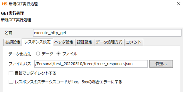 今回はレスポンスの内容を閲覧するだけなので、データ出力先を[ファイル]に、ファイルパスにはHULFT Squareの任意のディレクトリを入力します。