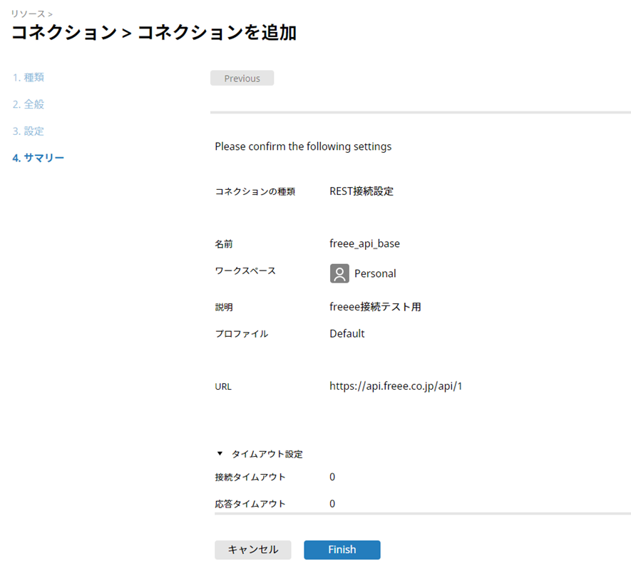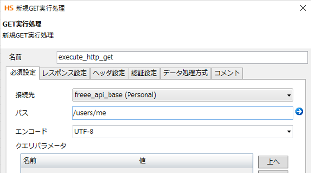 今回利用するAPIの最終的なendpointは[https://api.freee.co.jp/api/v1/users/me]なので、接続先設定で設定していない残りの
