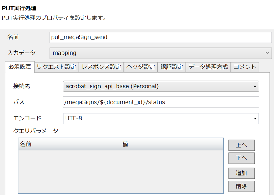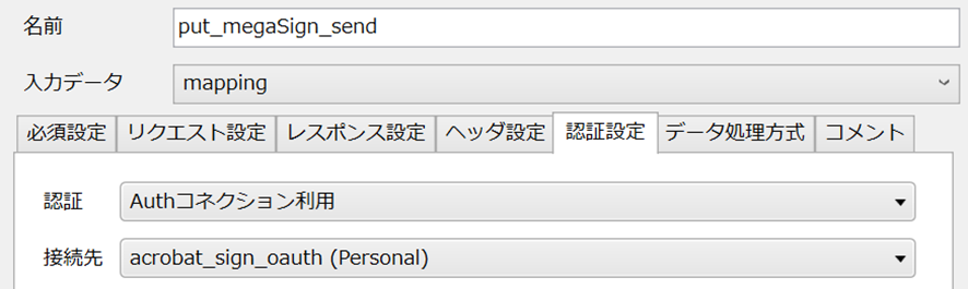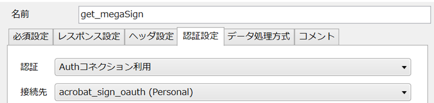 最後に認証設定タブの認証を[Authコネクション利用]に設定し、追加で表示された接続先から、先ほど作成した[Acrobat Sign_auth]を選択します。