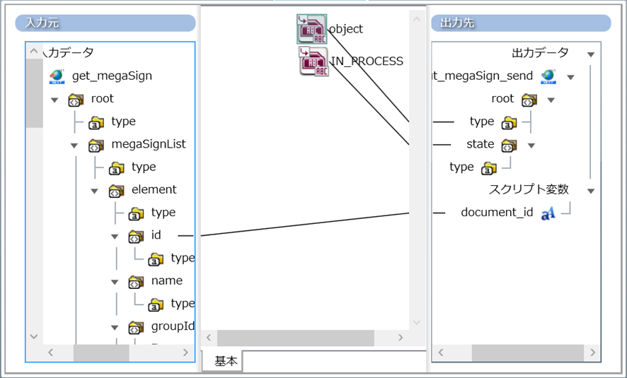 入力元の[root/megaSignList/element/id]をスクリプト変数の[document_id]へマッピング、また右のツールパレットから[文字列]>[単一行文字列定数]を基本マッピングフィールドに二つドラック&ドロップして、それぞれ以下のように設定します。
