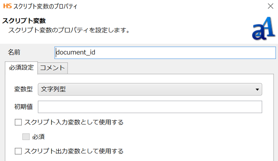 変数名は[document_id]、変数型は文字列を指定して、値は空にしておきます。