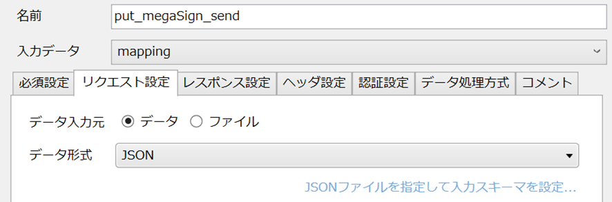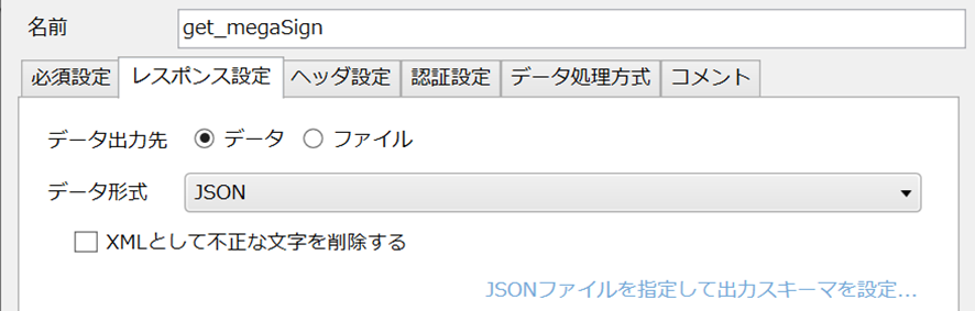 次にもう一度[get_megaSign]の設定を開きます。レスポンス設定を以下のように[データ]に変更し、青い[JSONファイルを指定して出力スキーマを設定]をクリックして、先ほど作成したjsonファイルを探して指定します。完了次第、完了ボタンをクリックして、タブを閉じましょう。