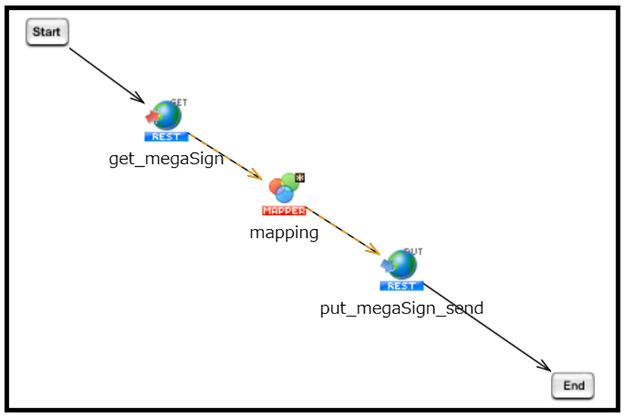 その後[get_megaSign]から[put_megaSign_sed]フローを作成します。ポップアップがあるので[プロセスフローとデータフローを引く]を選択し、[マッピングを追加する]にもチェックを入れておきます。