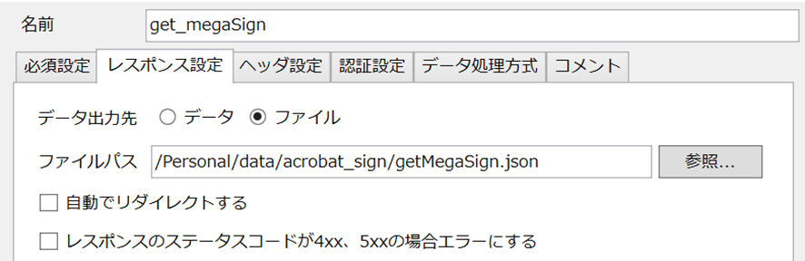 次に、レスポンス設定タブに移動します。ここではレスポンスをどのように扱うかの設定を行います。HTTPレスポンスのbodyをデータとして扱うためにはスキーマを設定する必要があるので、最初は[データ出力先]を[ファイル]に設定します。[ファイルパス]には任意の場所を指定します。整理しやすいよう、Acrobat Sign用フォルダを作成してその中に入れることをお勧めします。