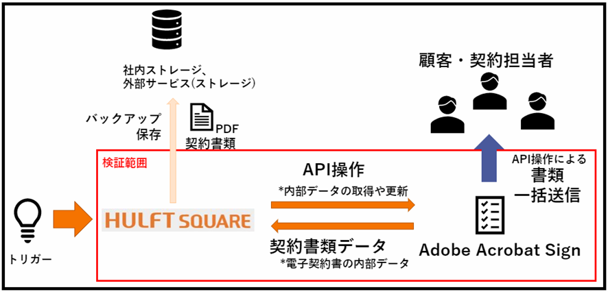 さらに、Acrobat SignにはAPIによる各種処理が実装されており、RESTを用いた他システムやサービスとの連携が可能です。例えば、以下のようにHTTPトリガー等を用いてHulft Squareの処理をキックし、APIを用いてAcrobat Signから契約書類を送信するなどが挙げられます。