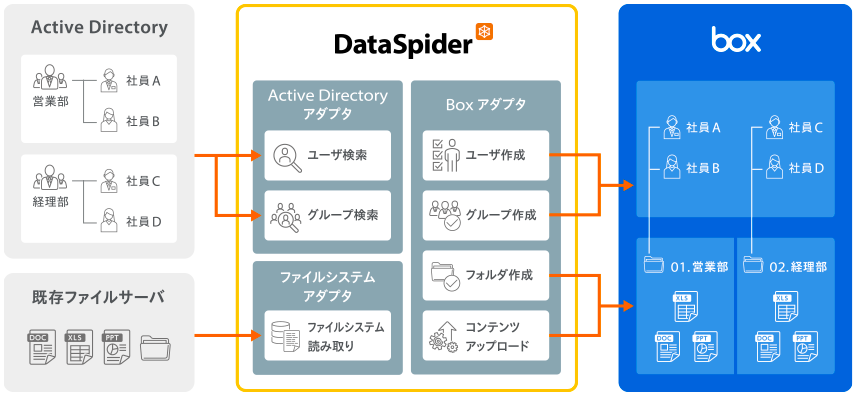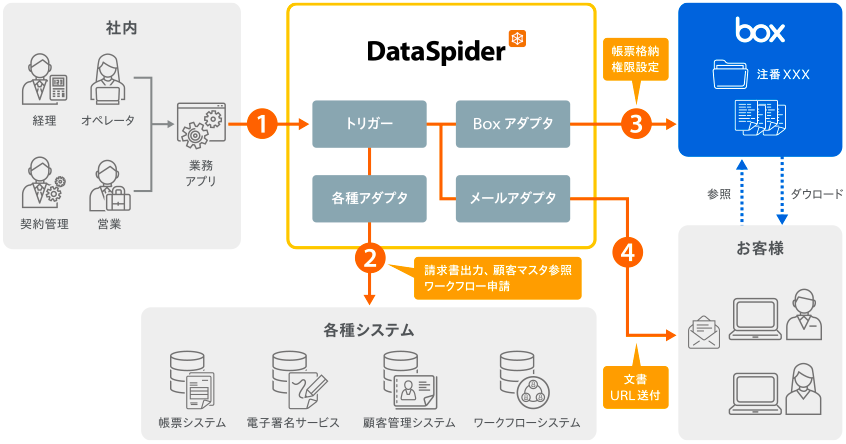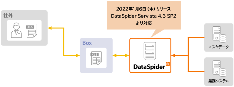 "DataSpider Adapter for Box" enables seamless integration between "Box," a cloud service for content sharing (file sharing) and collaboration that is seeing a rapid increase in users, and "DataSpider," which connects data and applications from different internal and external systems without programming.