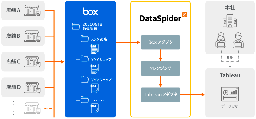 When a store uploads sales data to Box, the process can be automated, from importing the uploaded data, cleansing the raw data, and storing it in an analysis tool.