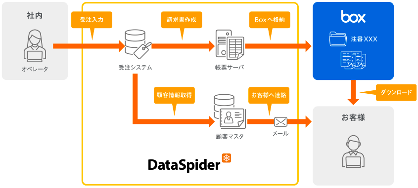 Once an internal operator registers an order in the order system, the invoice is issued and stored in Box, and a series of processes, including send an email to the customer confirming the issuance of the invoice, can be automated.