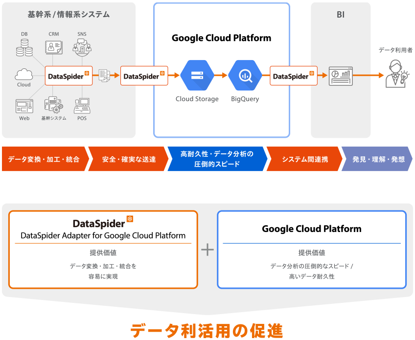 DataSpider connects data and applications without programming, and by using BigQuery to analyze large amounts of data scattered throughout the company, such as databases, mission-critical system, core system, and SFA/CRM, you can achieve data-driven decision-making that derives insights that can be used for business.
