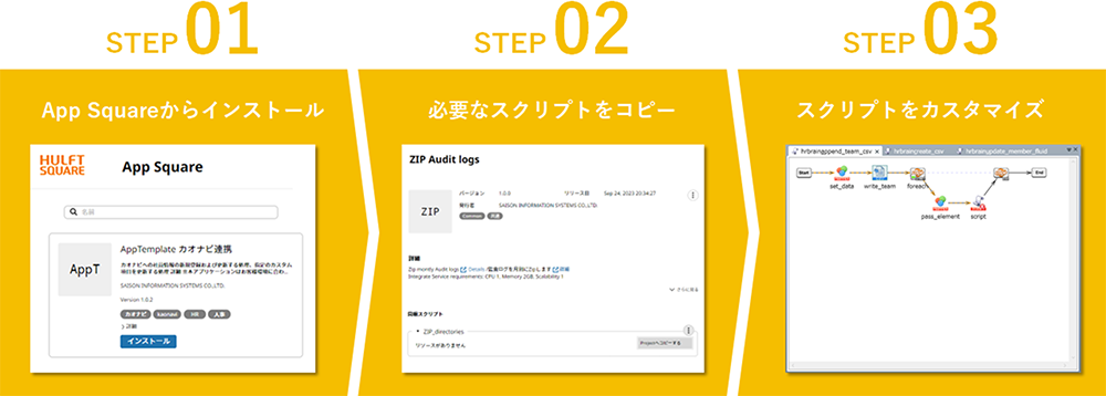 アプリケーションは、HULFT Squareをご利用中のすべての方が無料でご利用いただけます。ここではアプリケーションを利用するための3つのステップをご紹介します。