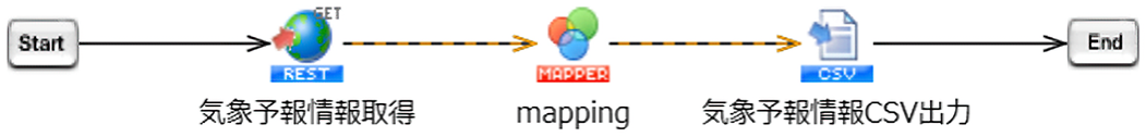 またダウンロードしたデータの出力先は、HULFT Squareストレージの「/OpenData/OpenData_No12_OpenWeather_気象予報取得」が設定されています。任意の出力先にダウンロードする場合は「天気予報情報CSV出力」のファイルを任意のパスに変更してください。