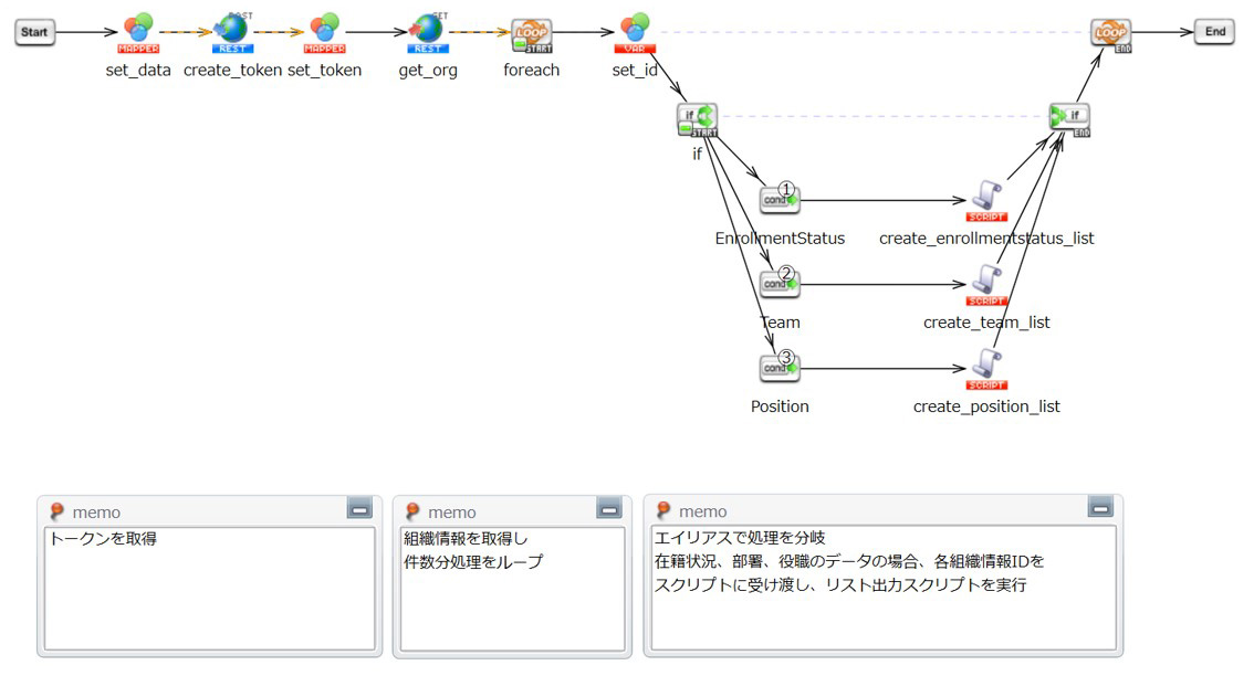 組織情報取得APIを実行し、「在籍状況」「部署」「役職」の組織情報IDをそれぞれのリスト作成スクリプトに渡します。