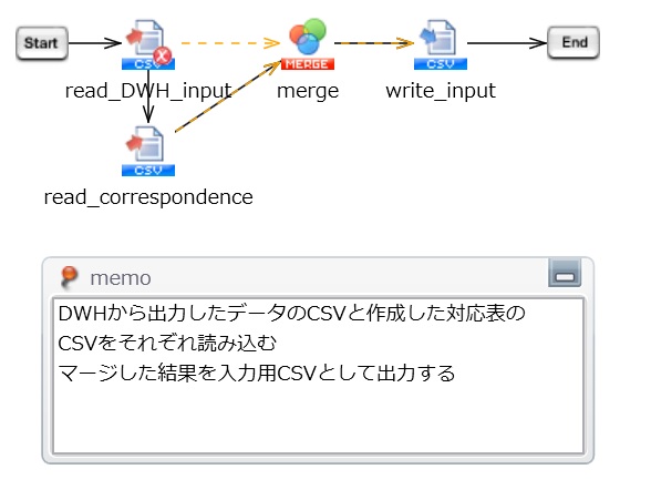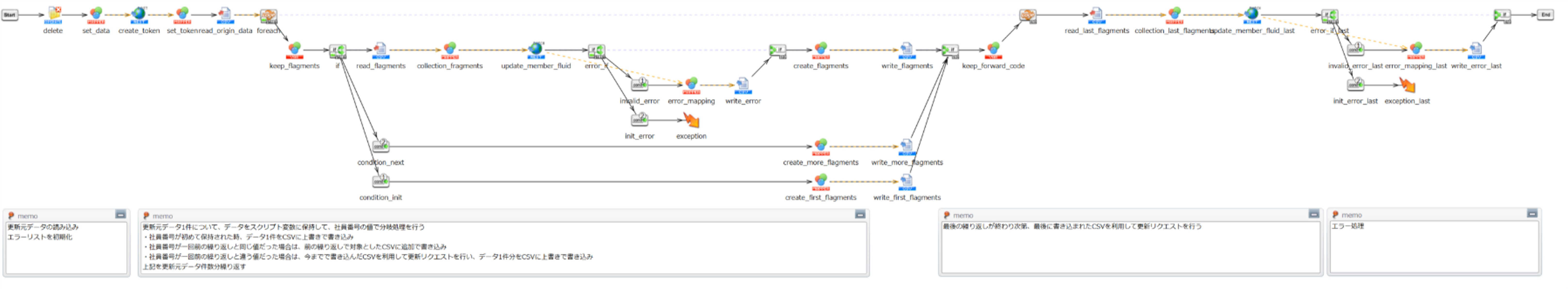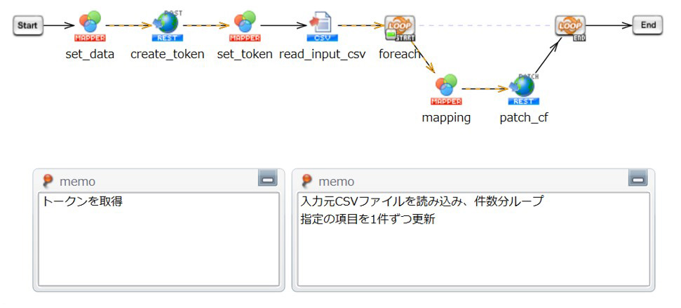 社員情報CSVファイルを社員ごとに分割するとともに、「在籍状況」「役職」「部署」の項目IDを突き合わせて「社員情報登録スクリプト」用の入力ファイルを作成します。
