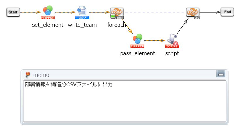 「部署IDリスト作成スクリプト」から部署データを受け取り、CSVファイルに部署IDと部署名を書き込みます。受け取った部署データに子部門がある場合は、さらに本スクリプトを繰り返し呼び出します。