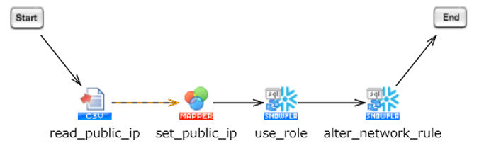 CSVファイルからパブリックIPアドレスを読み込み、Snowflakeのネットワークルールを更新します(ALTER NETWORK RULE)。