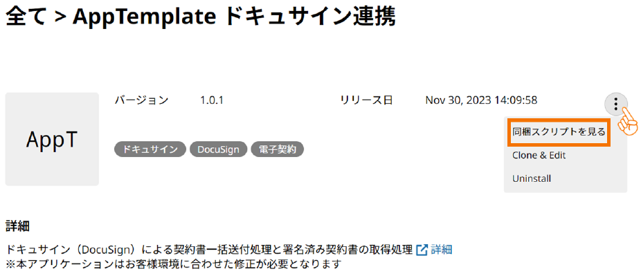 詳細ページ右上の三点リーダーをクリックして表示されるメニューから、「同梱スクリプトを見る」を押しましょう。