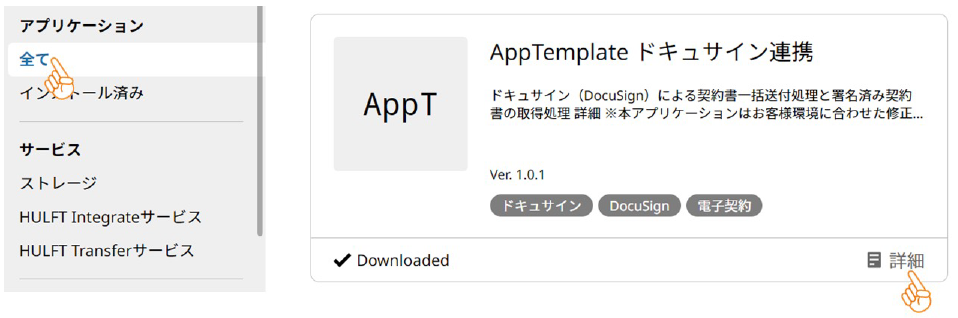 インストールされたアプリケーションは、HULFT Squareサイトの「全て」ページで確認できます。ナビゲーションメニューから「全て」を選んだら、アプリケーションの「詳細」リンクを押しましょう。