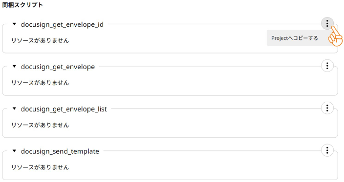アプリケーションに同梱されているスクリプトの一覧が表示されるので、三点リーダーをクリックして表示されるメニューから「Projectへコピーする」を選びます。