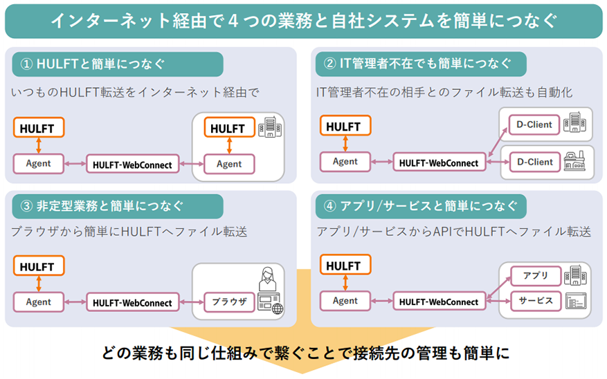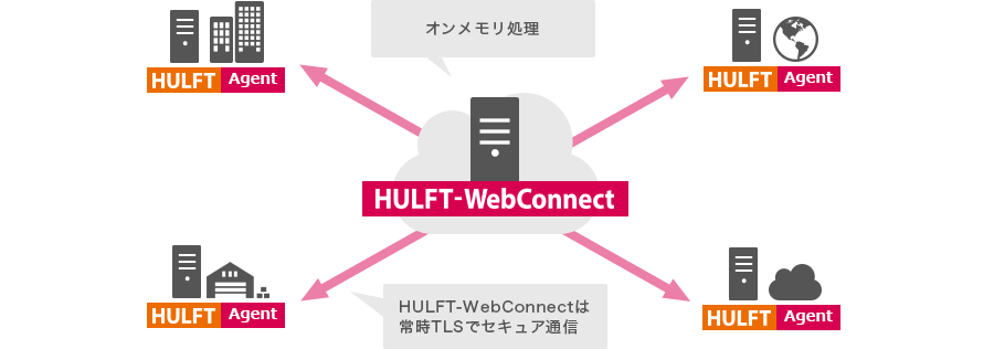 HULFT-WebConnect You can use HULFT to perform file transfer via the Internet by send request/transmission request of . Agent will automatically search for the nearest access point for HULFT-WebConnect to increase the efficiency of file transfer.