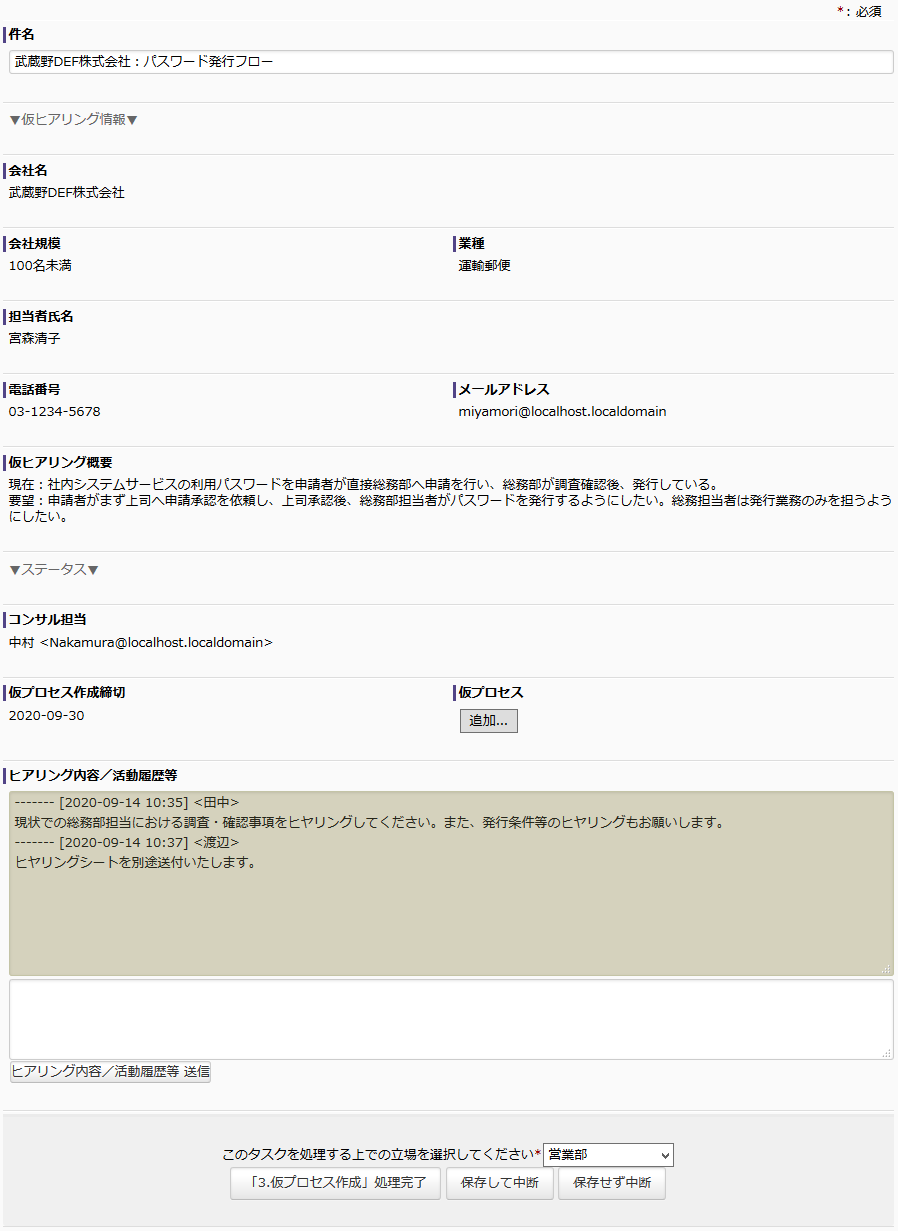 仮プロセスができると営業にタスクが割り当てられます。営業は仮プロセスの内容を確認、作成作業をやり直してほしい場合にはコンサルに差し戻します。ひとまず内容に問題が無い場合には、仮プロセスを顧客に提案します。