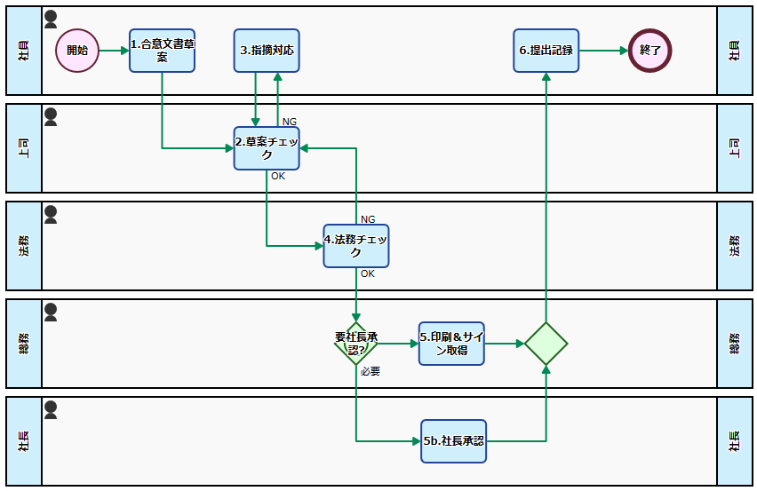 上司のチェックと法務によるチェックを経て、他社との合意文書を作成する業務フローですが、こちらでは社長によるチェックでNG(戻し)が発生する場合が十分あることが前提となっています。