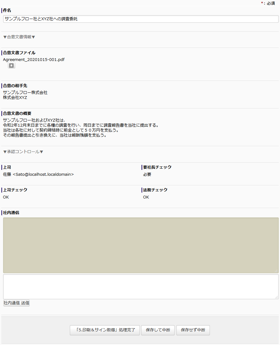 法務でのチェックで問題なければ、社長承認が必要な合意文書の場合には社長に内容の確認をするタスクが割り当てられます(5b.社長承認)。また平行して合意文書は総務担当者によって印刷されて完成します(5.印刷&サイン取得)。