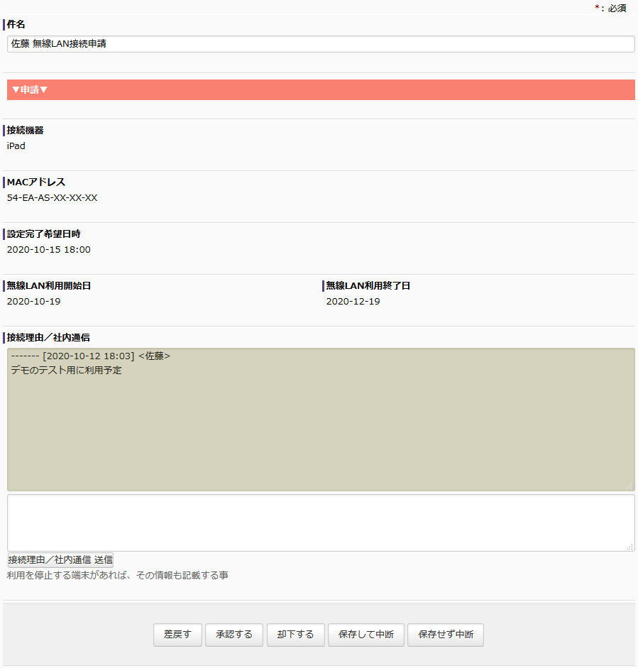 アクセスできる端末をきちんと管理するために、申請時に必ずMACアドレス(その端末固有の情報)を登録してもらう仕組みになっています。また、上司のチェックを経ることで、申請する必要性があることもチェックしています。