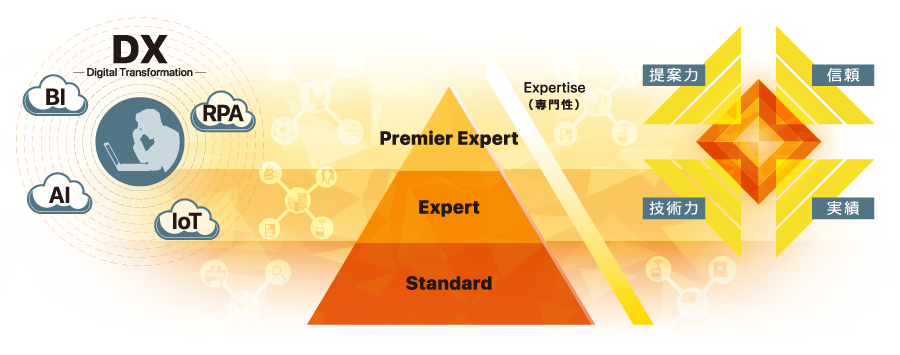 In order for customers to achieve digital transformation using IT technologies such as RPA, BI, AI, and IoT, they need experts with excellent skills and track records, who are highly trusted in the market, and who can make appropriate proposals to address their unique challenges.