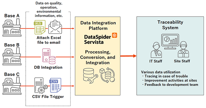 As a global leader in the field of automation, OMRON’s business fields cover a broad spectrum, ranging from industrial automation and electronic components to healthcare. As part of its efforts to identify the scope of the impact caused by failures and other problems at production base and to improve on-site work operations, the company is building a traceability system to visualize factory operating conditions. DataSpider Servista plays a pivotal role in OMRON's operations, efficiently converting information from various environments at each site, such as Excel and existing distributed systems, into an appropriate format and seamlessly linking the data with the upper-level traceability system.