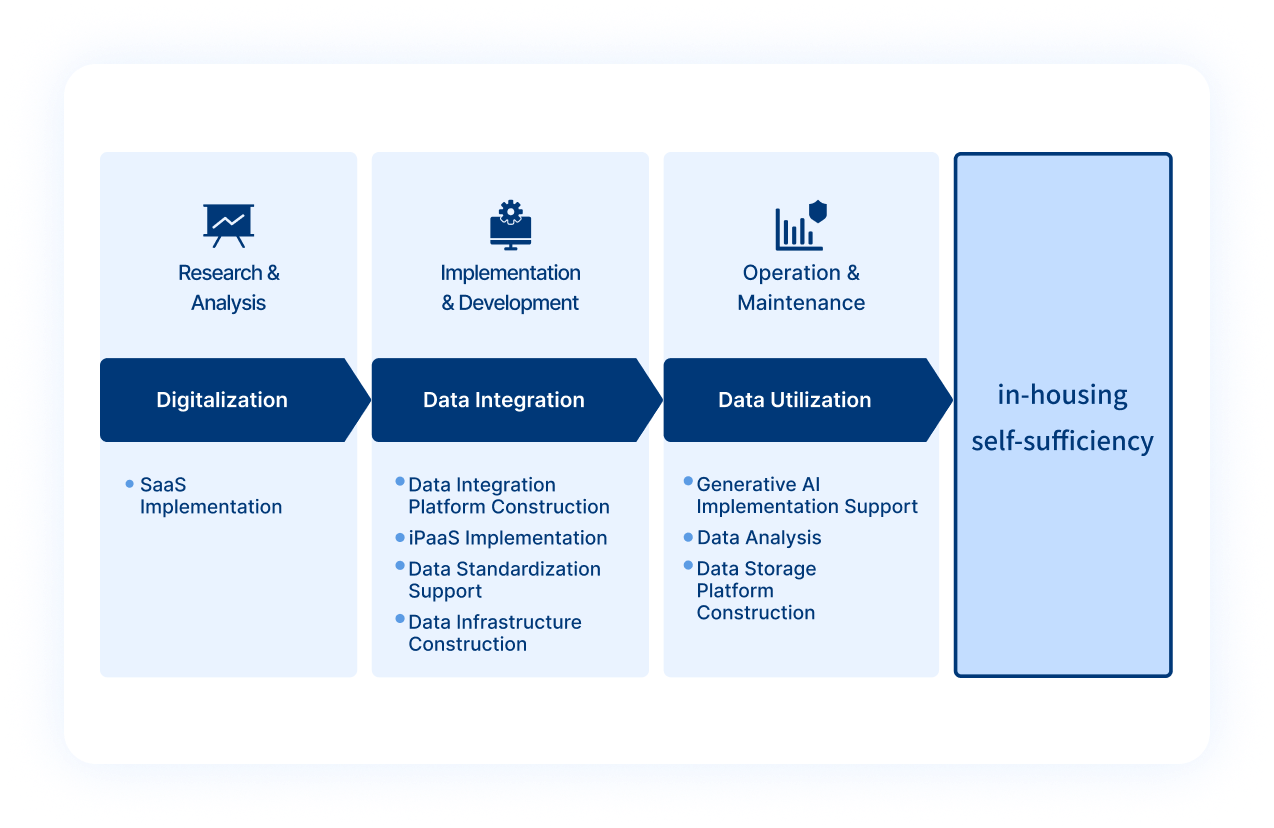 We support optimal data integration for our customers, including the introduction of SaaS, the construction of data integration platform, and visualization for utilizing data.