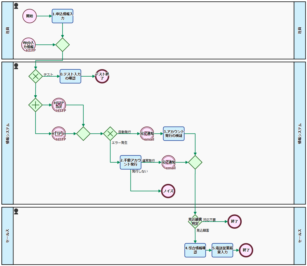 以上のプロセスフローでは、「無料体験版の申し込みデータをシステムがきちんと受け取っているか」を「情報システム部」がテスト実行できるようになっていました。