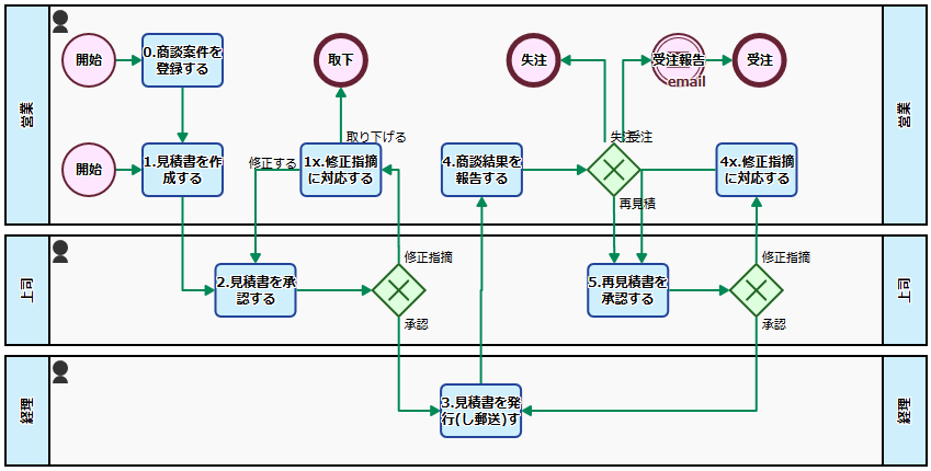 修正指摘がある場合、タスクは営業に戻されます(1x. 修正依頼に対応する)。営業は内容を修正して再度上司に承認をお願いするか、あるいは見積書を取り下げます。取り下げた場合はそこでプロセスは終了となります。