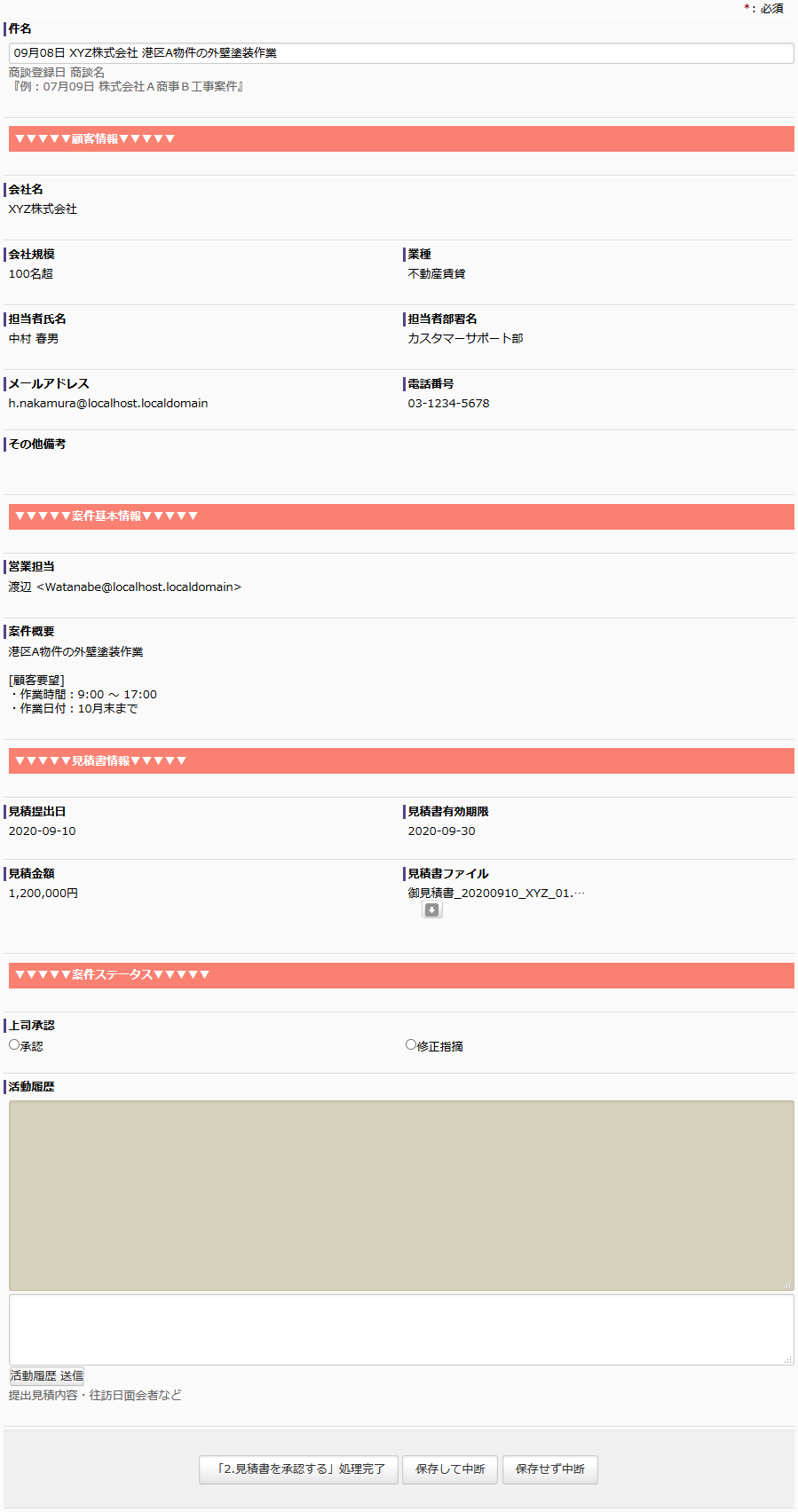 営業が見積書を作成すると、上司に見積書の内容確認タスクが割り振られます。上司は内容を確認し、承認ないしは修正指摘をします(2. 見積書を承認する)。
