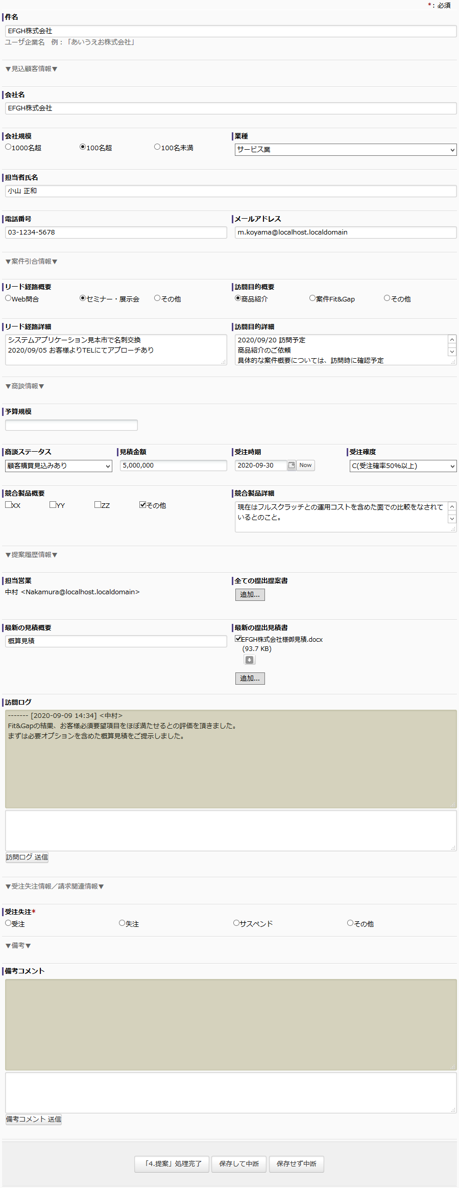 「契約交渉」に至った営業案件については、最終的にその結果がどうだったかを入力します(6.受注失注確認)。結果報告が終わるとプロセスは終了します。