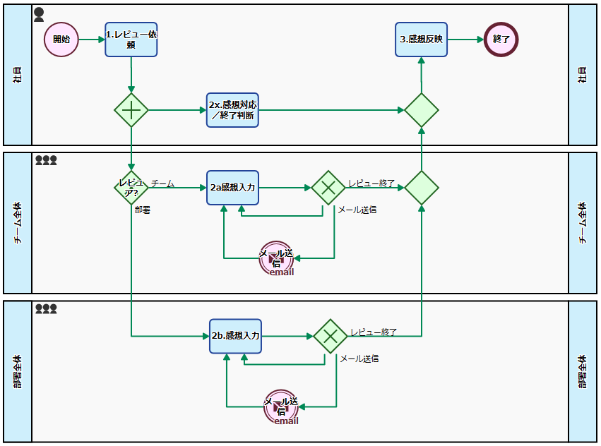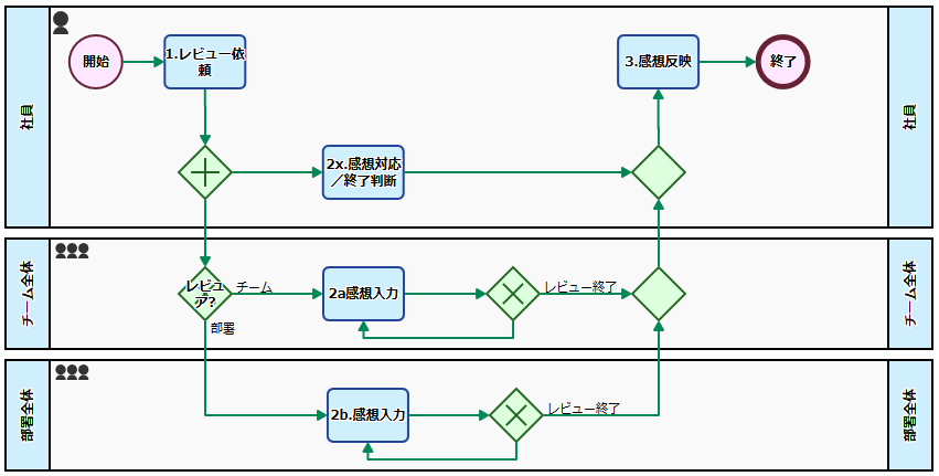 レビュー依頼がなされる(「2a. 感想入力」ないしは「2b. 感想入力」)のと並行して、並行ゲートウェイによりレビューコメントに対応するタスクが依頼者に割り当てられます(2x. 感想対応/終了判断)。