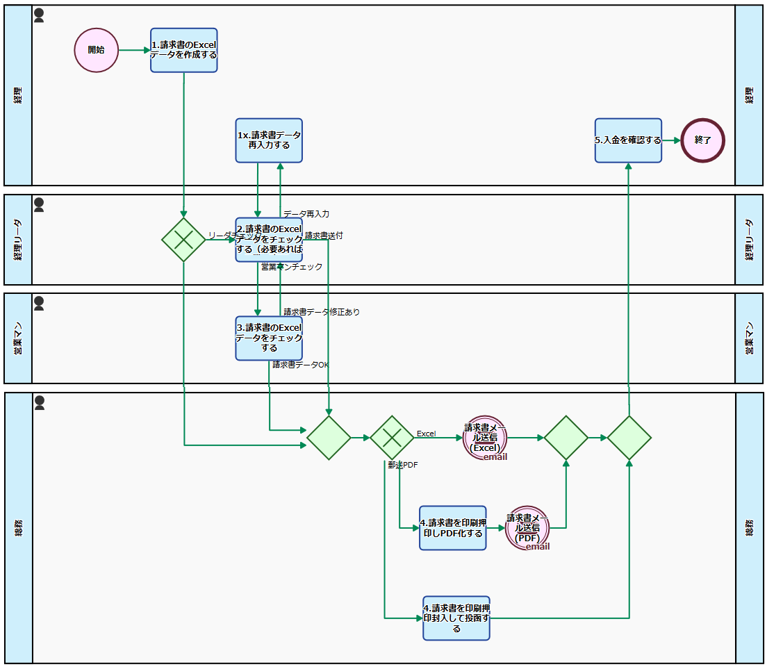 経理担当者がExcelで請求書を作成、請求書の内容確認を経て、送付形態にあわせて総務が請求書を送付、経理担当者が入金確認をするプロセスフローです。