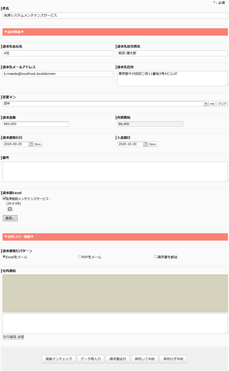 電子データの送付で良いが押印が必要な場合には総務で手作業にて印刷して押印しPDFを作成するタスクが割り当てられます(4. 請求書を印刷押印しPDF化する)。作成されたPDFファイルはシステムが電子メールで送付します。