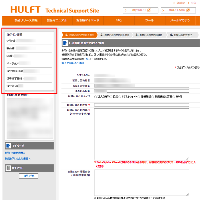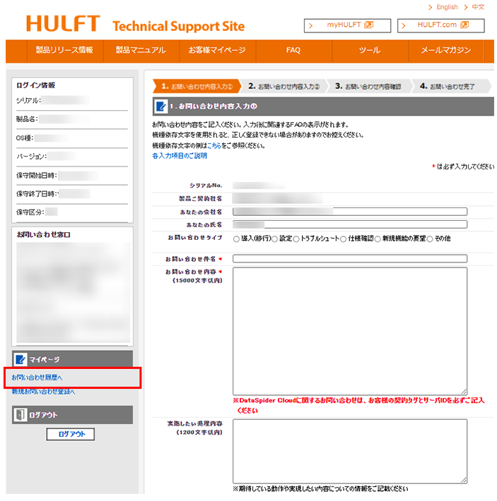 合致しない場合は、技術サポートサイトから一旦ログアウトし、myHulft からお問い合わせの製品シリアルで [お問い合わせ] からアクセスしてください。
