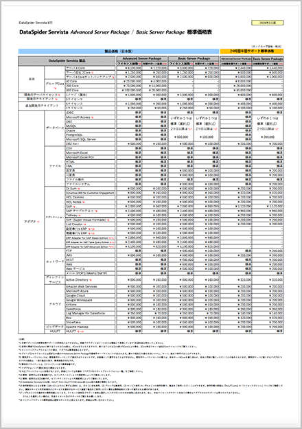 | プロフェッショナルサービス | DataSpiderに関する技術コンサルティング、チューニング、スクリプト開発、システム設計等、お客様のご要望に応じて弊社パートナーを紹介するなどのご支援をいたします。詳細についてはお問合せください。 |