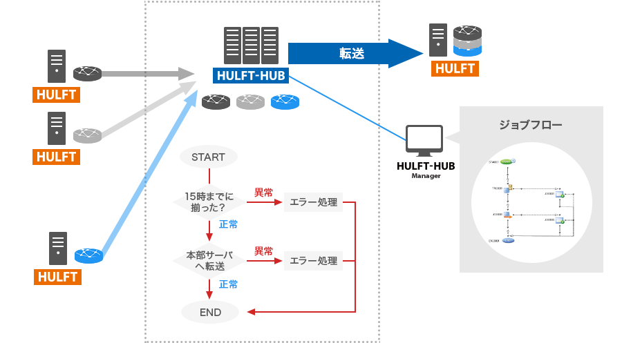 ファイル授受の設定や運用を効率化。 中継や「HULFT」の動作状況にあわせた 集信などを自動化できます。